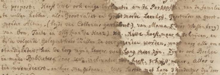 ‘bij de oude Fockens dronk ik een kopjen thee, alwaar ik antrof juffr. Wassenborg.[8] Haar Eedl. lieten mij zien de beyde portraitten van haar zoon den raadsheer en vrouw, in datzelve formaat van den 5 nichtjes en van dezelve hand geschildert.’[9]